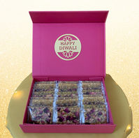 A perfect blend of sweets - assorted brittles, almond florentine, and date & fig squares in a customized festive box have a different take on the traditional Diwali sweets!